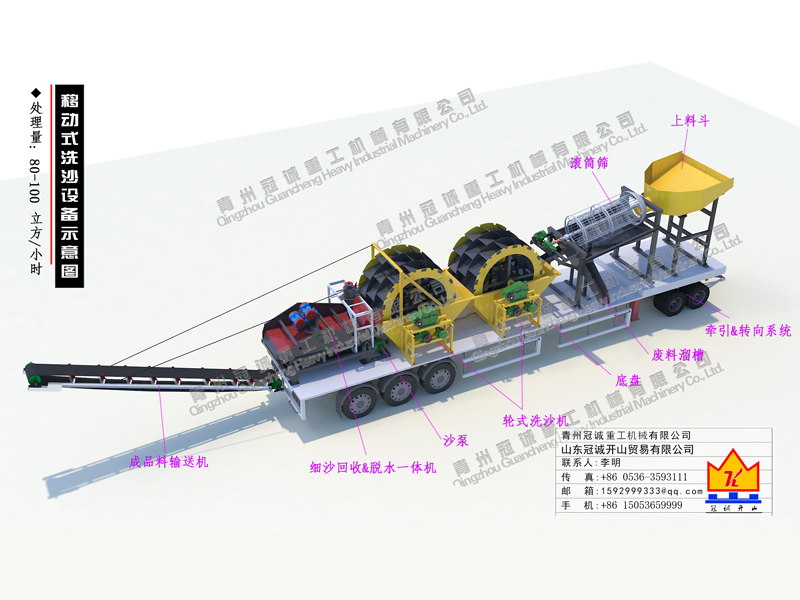 該產(chǎn)品為80-100立方移動式洗砂設(shè)備,采用車載輪胎式移動,搭配兩臺三排輪斗洗沙機,加裝移動細(xì)沙回收脫水設(shè)備,操作簡單,流動式作業(yè),隨洗隨走,省卻了打底座的煩惱,省時高效。