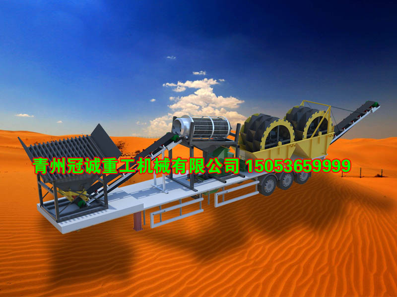 本套移動(dòng)破碎站為移動(dòng)式制沙水洗設(shè)備,處理量為每小時(shí)100-120立方(150-180噸)??梢允褂冒霋燔囶^或者挖掘機(jī)、裝載機(jī)等牽引車輛輕松移動(dòng)到工作場(chǎng)地。本移動(dòng)破碎站是青州冠誠(chéng)重工機(jī)械有限公司獨(dú)立設(shè)計(jì)制作而成,直接采用17.5米半掛車底盤改裝制作,基優(yōu)勢(shì)如下: