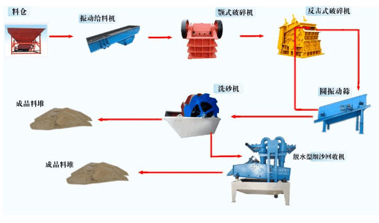 對于一套完整的水洗砂生產(chǎn)線來說,其除了包含有洗砂機(jī)這一核心洗砂設(shè)備外,其肯定還會(huì)含有制砂機(jī),甚至還有粗、細(xì)碎破碎機(jī)(通常情況下,多為顎式破碎機(jī)與反擊式破碎機(jī)),用于完成對大塊砂石物料的粗、細(xì)碎作業(yè)。具體各設(shè)備之間配合生產(chǎn)工藝流程如下: